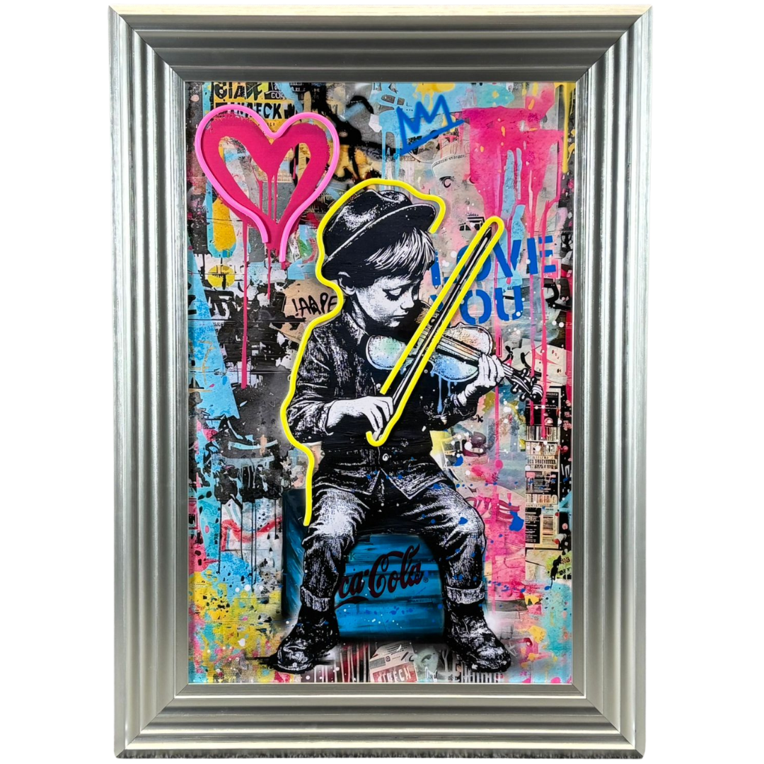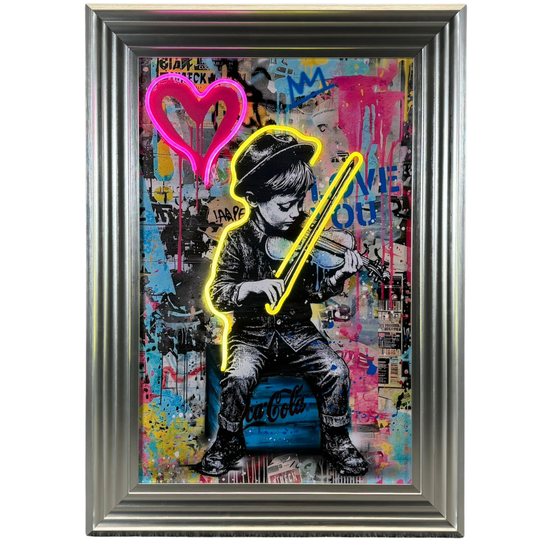 - > Framed LED Wall Art Banksy Picture of a Boy Playing the Violin