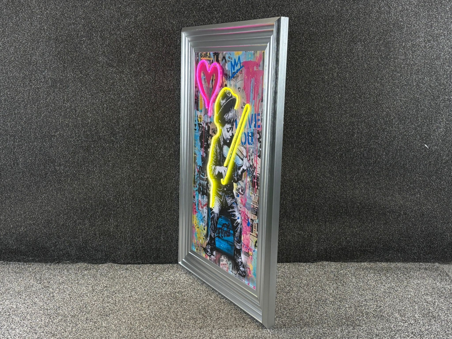 A brand new silver framed LED wall art Banksy picture featuring