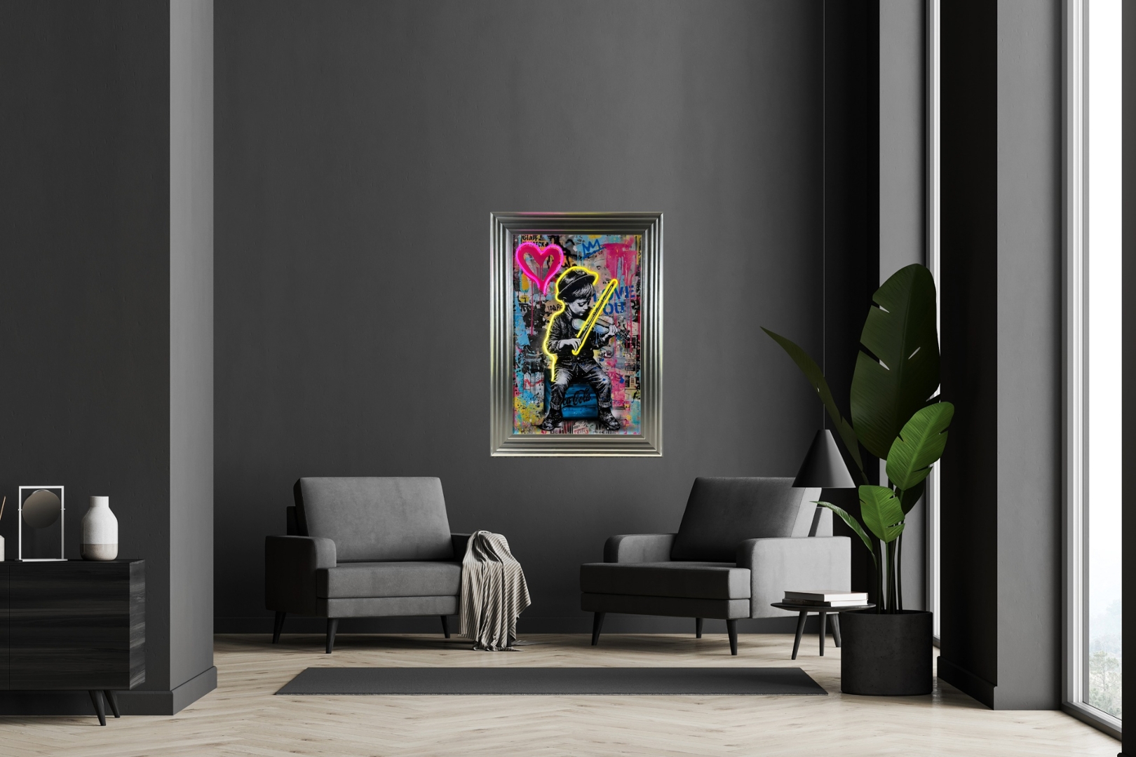 - > Framed LED Wall Art Banksy Picture of a Boy Playing the Violin