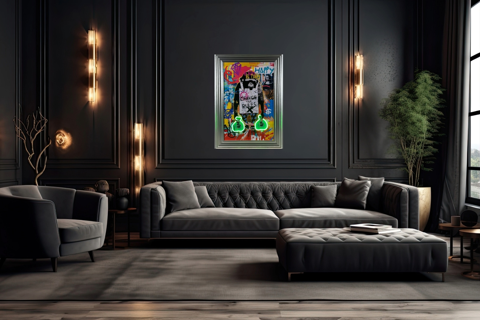 A brand new silver framed LED wall art Banksy picture titled Change The Rules, showcasing a bold graffiti-style monkey holding two illuminated money bags. This vibrant piece blends chaotic street art textures with sharp monochrome stencilling, creating a striking contrast that instantly draws the eye. The neon-style LED lighting adds an exciting modern twist, making the artwork come alive whether displayed in a living room, office, bar, or creative space. Every detail — from the expressive colours to the rebellious message — is designed to create a standout centrepiece.