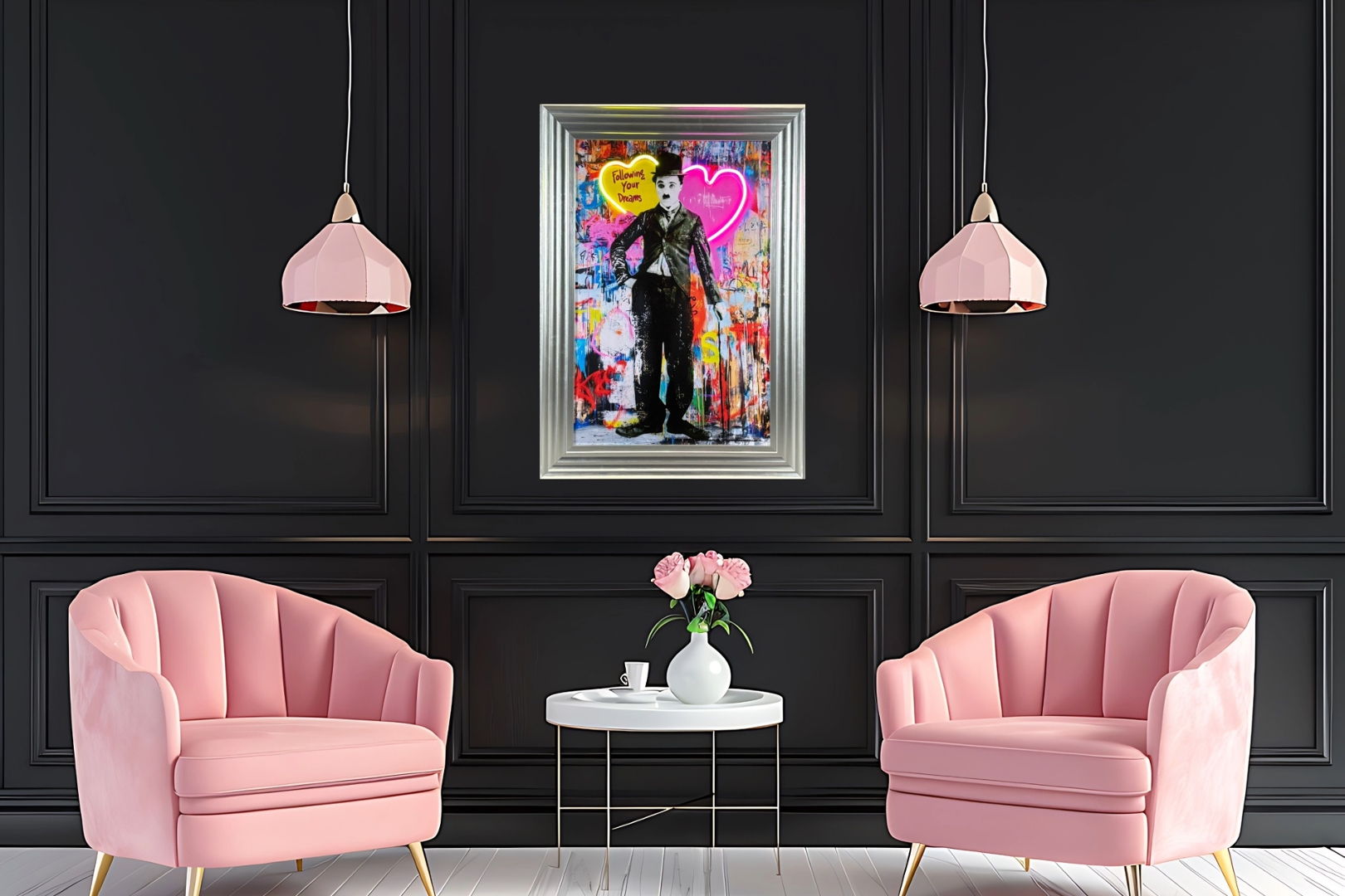 - > Framed LED Wall Art Banksy Picture of Charlie Chaplin - Following Your Dreams