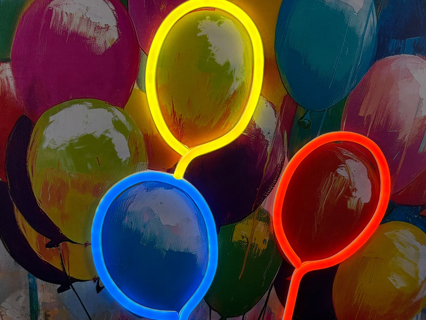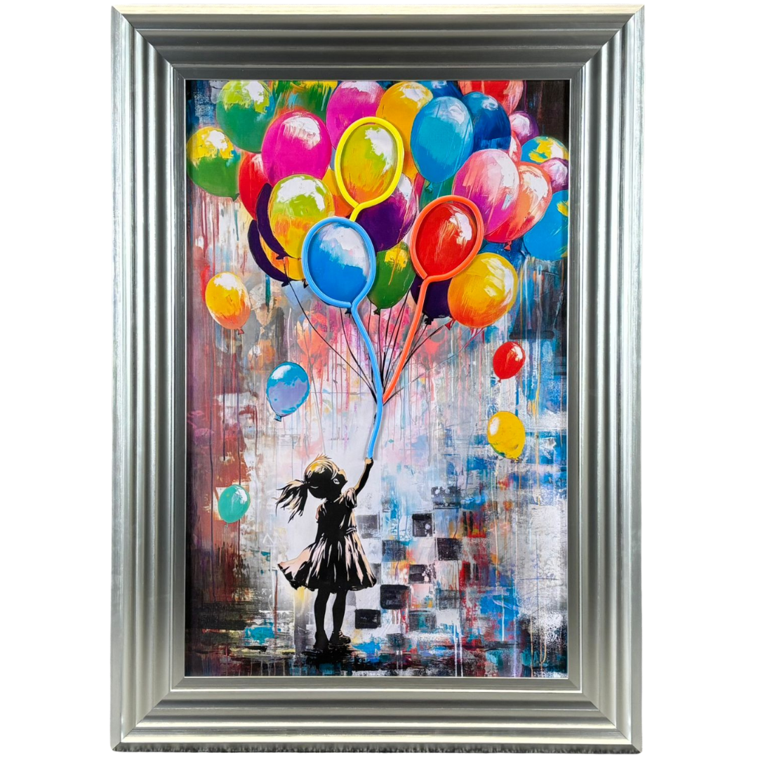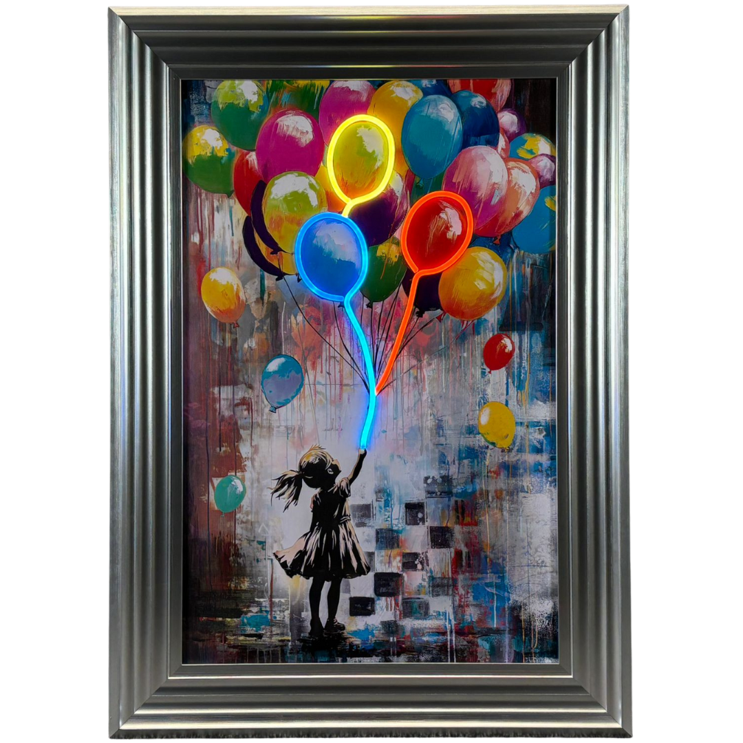 - > Framed LED Wall Art Picture of a Girl with Colourful Balloons