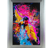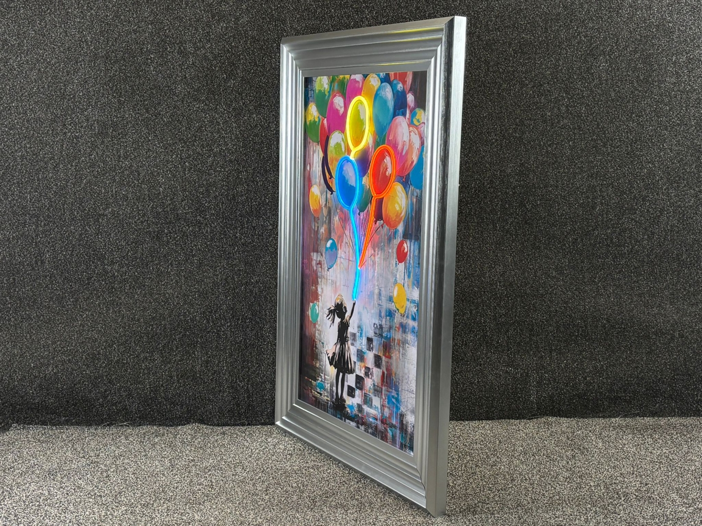 A brand new silver framed LED wall art picture of a Girl with Colourful Balloons. This picture features a power button at the bottom and a battery pack.
