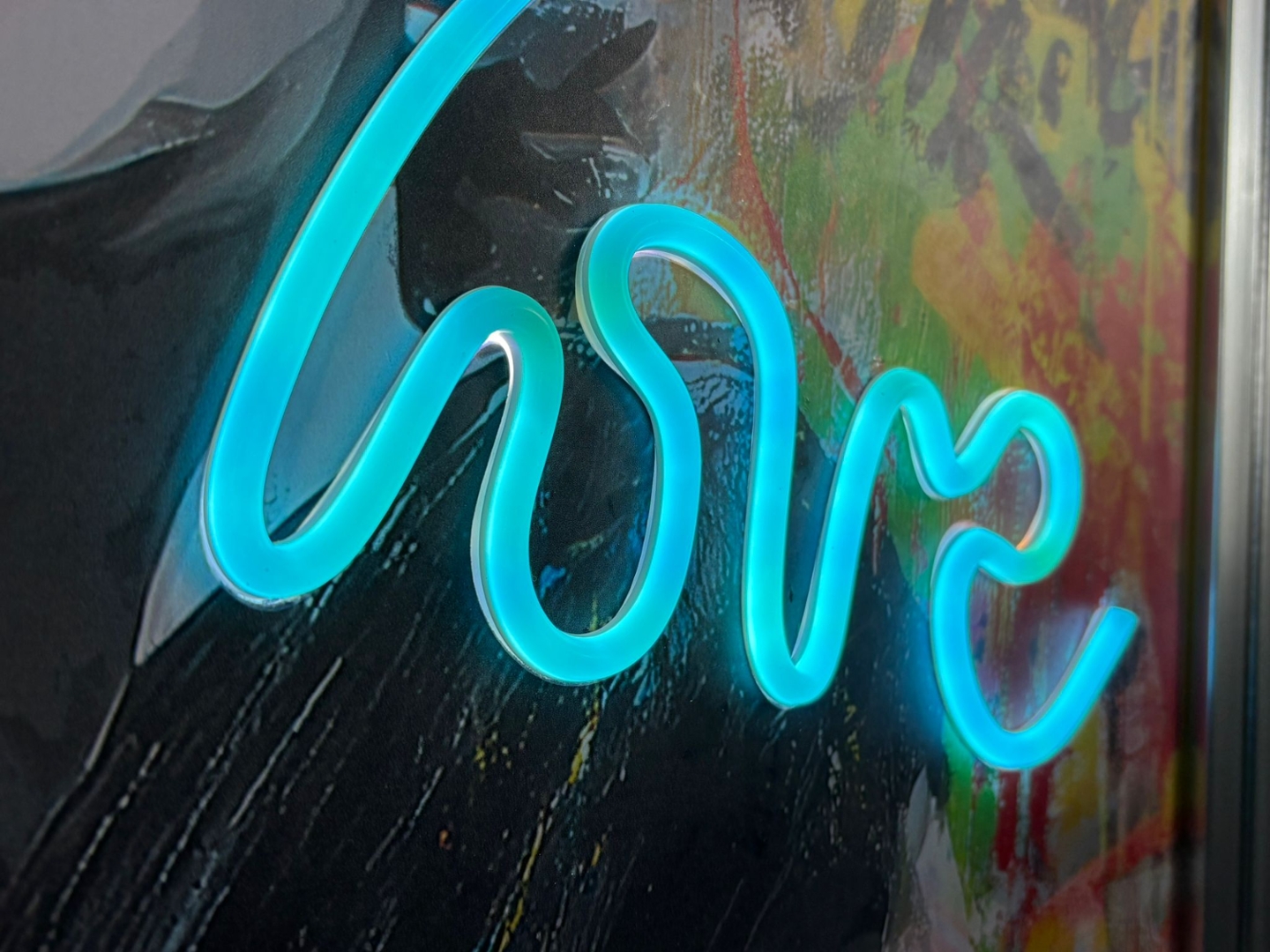 A brand new silver framed LED wall art picture of a Graffiti Marilyn Monroe - Love. This picture features a power button at the bottom and a battery pack.