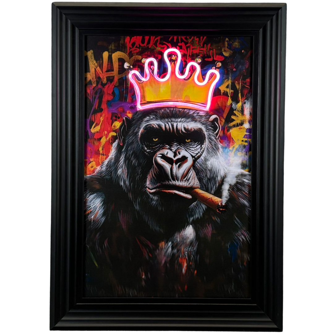 A brand new black framed LED wall art picture of a King Gorilla. This picture features a power button at the bottom and a battery pack.