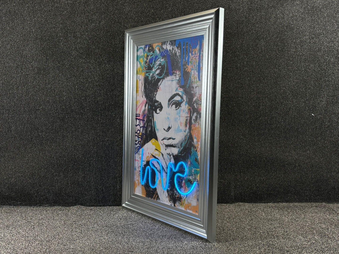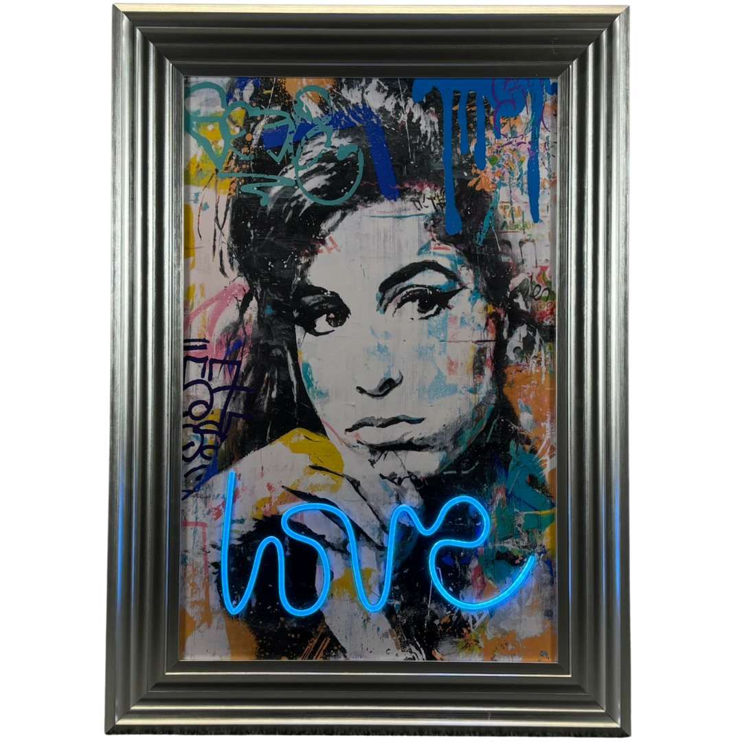 A silver framed LED wall art features a striking mixed-media portrait of Amy Winehouse, brought to life with a vibrant street-art aesthetic and a bold electric-blue ‘love’ LED script that adds an immediate glow. The expressive brushwork and graffiti-inspired background create a dynamic contrast with the monochrome portrait, giving the piece a modern edge while still capturing Amy’s unmistakable presence. With the LED turned on, the artwork gains an eye-catching luminosity, yet it remains equally impactful with the lights off thanks to its rich colours and layered texture.