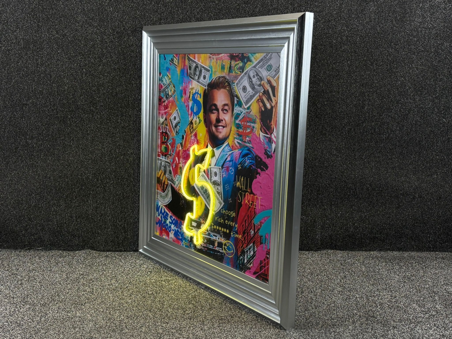 A brand new silver framed LED wall art piece captures the high-energy charisma of Leonardo DiCaprio in his iconic Wolf of Wall Street role. The artwork explodes with colour, graffiti textures and layered imagery, creating a thrilling backdrop of dollar bills, symbols and bold street-style markings. At the centre, DiCaprio’s confident expression and sharp suit dominate the scene, surrounded by vibrant splashes of pink, yellow and electric blue that amplify the energetic financial chaos the movie is known for.