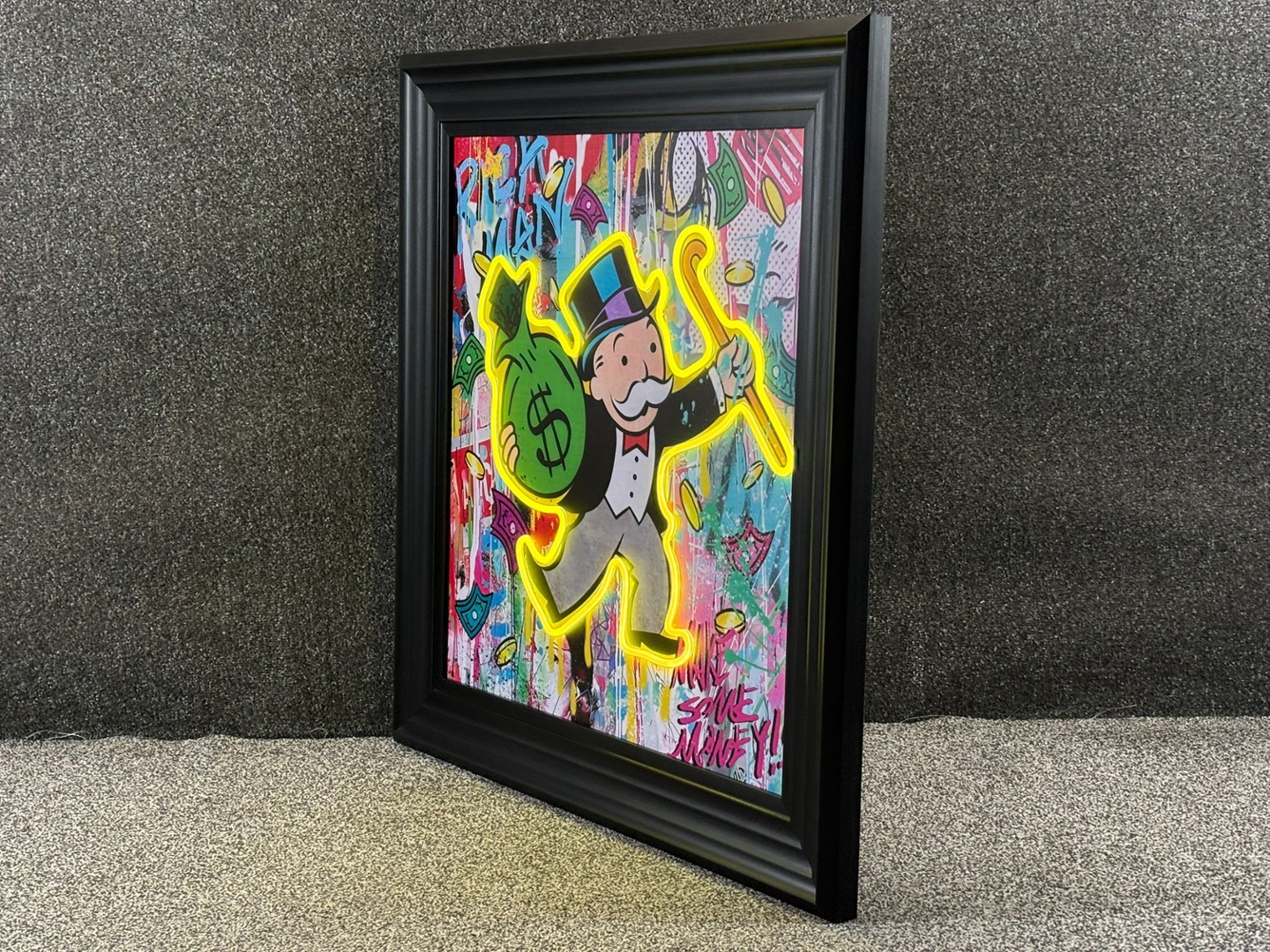 - > Framed LED Wall Art Picture of The Monopoly Man Carrying his Money