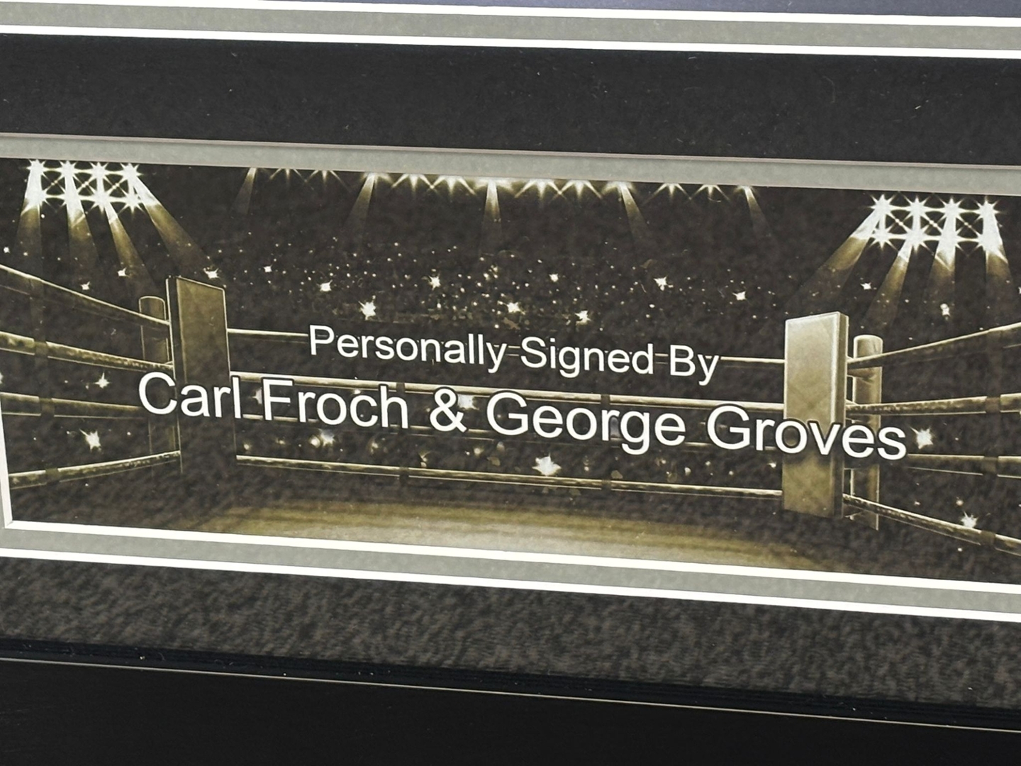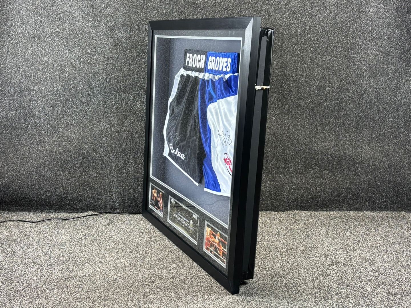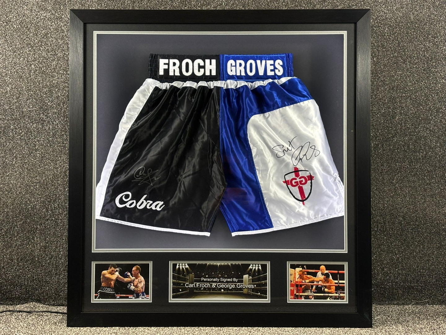 A signed and authenticated Cark Froch & George Groves Boxing Shorts in a presentation frame. Approx 89cm height, 83cm width.