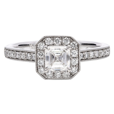 A brand-new, unused GIA-certified natural diamond solitaire engagement ring, with one asscher-cut diamond to the centre & a cluster of brilliant-cut diamonds in a halo setting & to the shoulders, set in platinum.