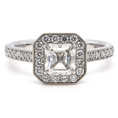 A brand-new, unused GIA-certified natural diamond solitaire engagement ring, with one asscher-cut diamond to the centre & a cluster of brilliant-cut diamonds in a halo setting & to the shoulders, set in platinum.