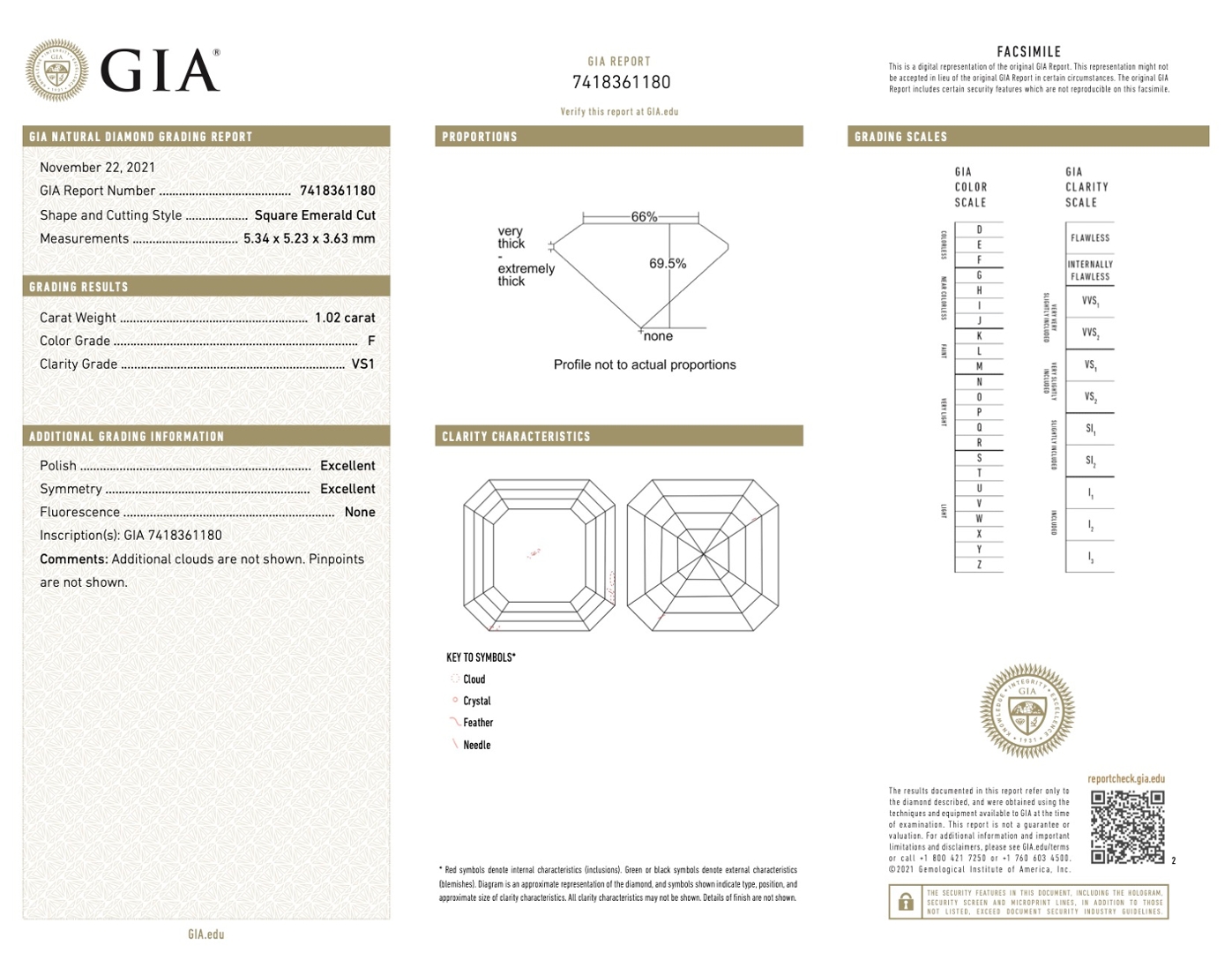 A brand-new, unused GIA-certified natural diamond solitaire engagement ring, expertly crafted in platinum and offered in pristine condition. The centrepiece is a beautifully proportioned 1.02-carat Asscher-cut natural diamond, graded F for colour and VS1 for clarity, with crisp step facets, strong symmetry, and a bright, refined presence. A surrounding halo of brilliant-cut natural diamonds gracefully extends along the shoulders, adding 0.29 carats and enhancing light performance, finger coverage, and overall visual impact without overwhelming the centre stone.