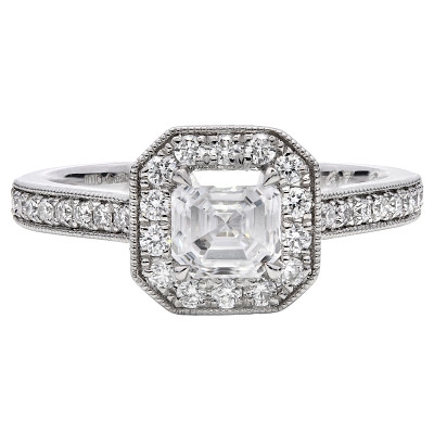 A brand-new, unused, GIA-certified natural diamond solitaire engagement ring, with one asscher-cut diamond to the centre & a cluster of brilliant-cut diamonds to the shoulders, set in platinum.