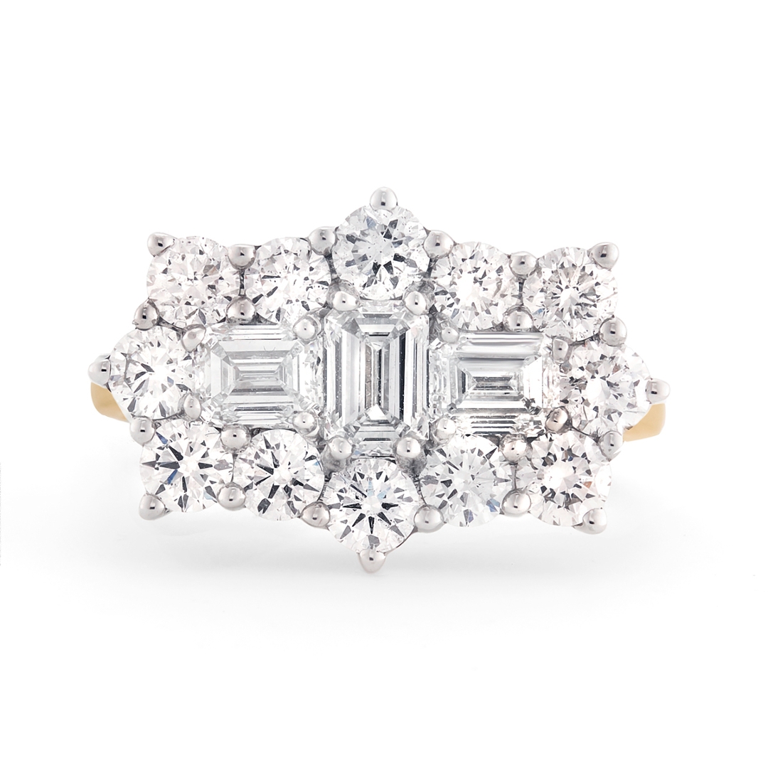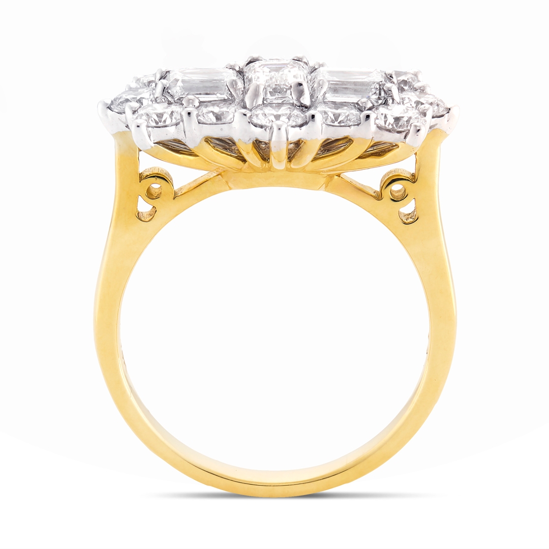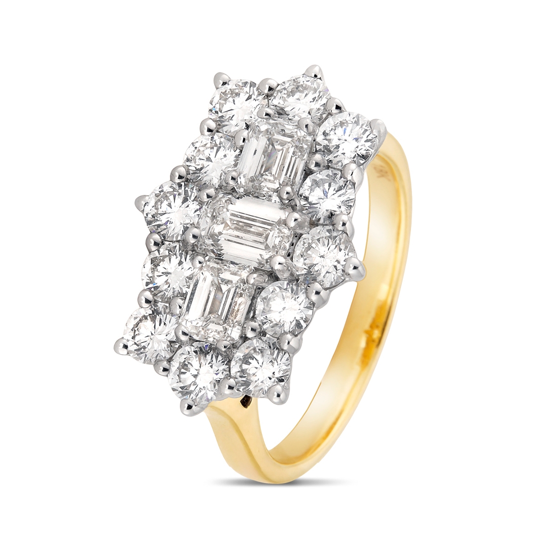 A brand-new, unused 18ct yellow and white gold cluster ring, finely set with natural diamonds that capture both rarity and refinement. At the heart of the design sit three emerald-cut stones totalling 1.30 carats, graded H in colour and VS1 in clarity, displaying the crisp elegance that makes this cut so sought after. Surrounding them, twelve round brilliant-cut natural diamonds provide an additional 1.63 carat of brilliance, with colour grading between F and G and clarity between VS2 and SI1, forming a radiant halo that enhances the shape and depth of the piece. With a weight of 6.26 grams. The craftsmanship of the mount blends warm yellow gold with bright white settings, ensuring the diamonds display their natural fire to full effect.