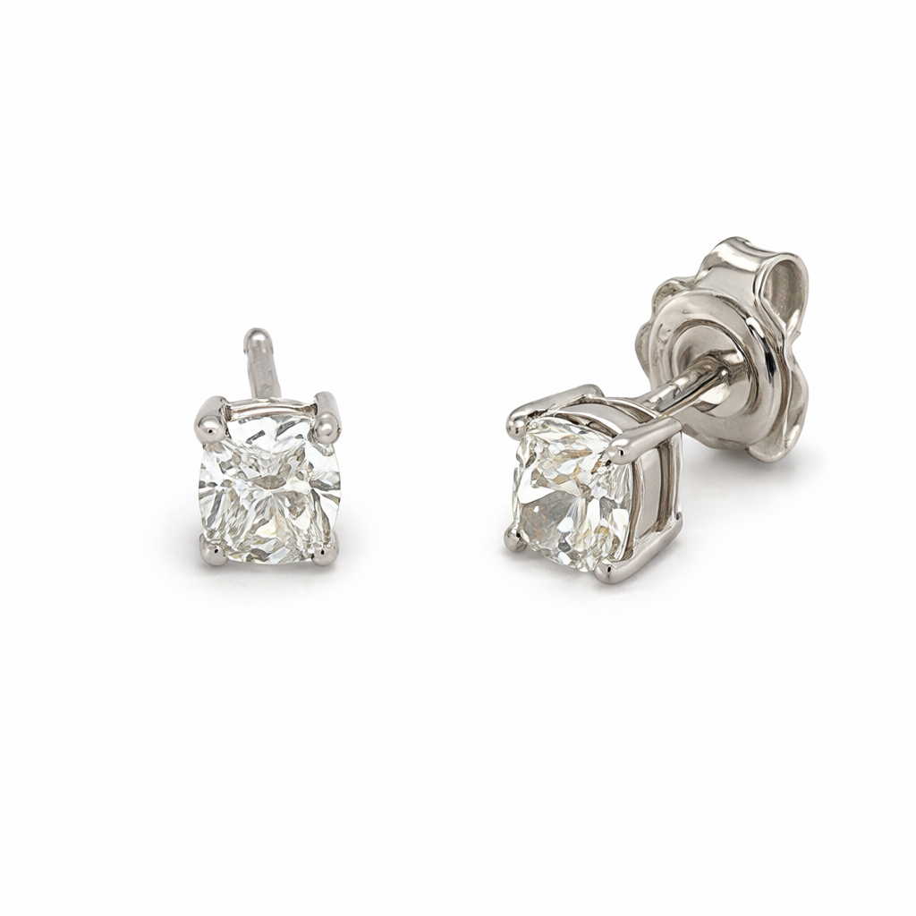 A brand-new, unused GIA-certified pair of natural diamond solitaire earrings, finely crafted in 18ct white gold and designed to offer timeless elegance with lasting value. Each earring is set with a cushion-cut natural diamond, totalling 1.40 carats, graded G colour, VS clarity. The cushion cut delivers a refined balance of softness and brilliance, while the white gold setting provides a clean, contemporary frame that enhances brightness and ensures secure everyday wear without distraction or excess ornamentation.