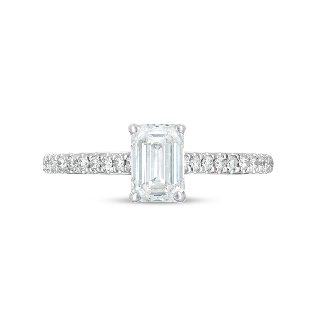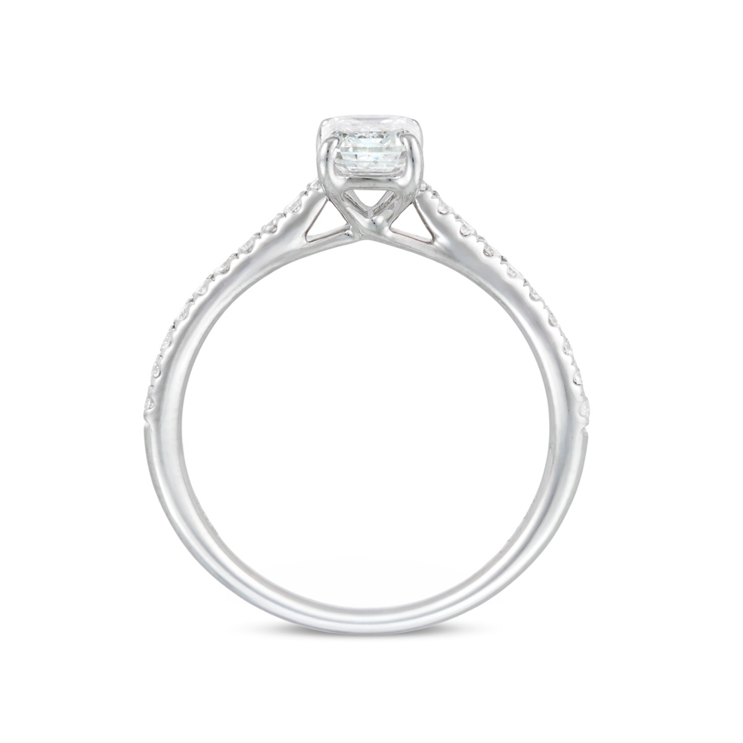 The 18ct white gold setting offers a clean, contemporary finish that pairs effortlessly with the linear geometry of the emerald-cut diamond, creating a balanced and sophisticated profile. Weighing 2.60g, the ring is both lightweight and refined, designed for comfortable wear while maintaining a luxurious presence on the hand. Its timeless styling ensures lasting appeal across changing trends.
