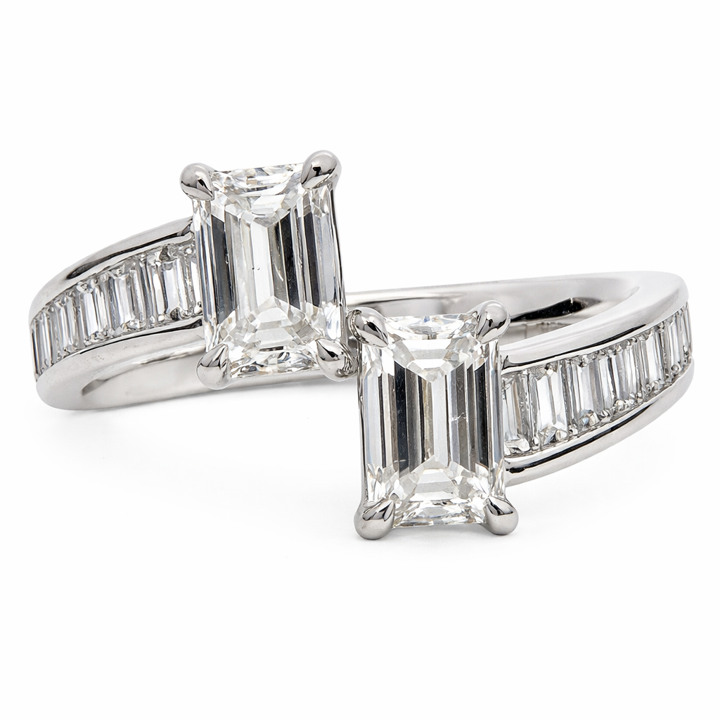 A brand-new, unused GIA-certified natural diamond toi et moi cluster ring, set with two emerald-cut diamonds at the centre and a cluster of baguette-cut diamonds to the shoulders, all crafted in platinum. The principal stones, with a combined weight of 1.20ct, showcase the clean, linear faceting of the emerald cut, producing a refined hall-of-mirrors effect that favours clarity and symmetry. The toi et moi design introduces both balance and meaning, while the structured baguette accents complement the central stones with a sleek, architectural finish.