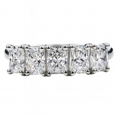 A brand-new, unused, GIA-certified platinum natural diamond five-stone eternity ring, set with five radiant-cut diamonds.