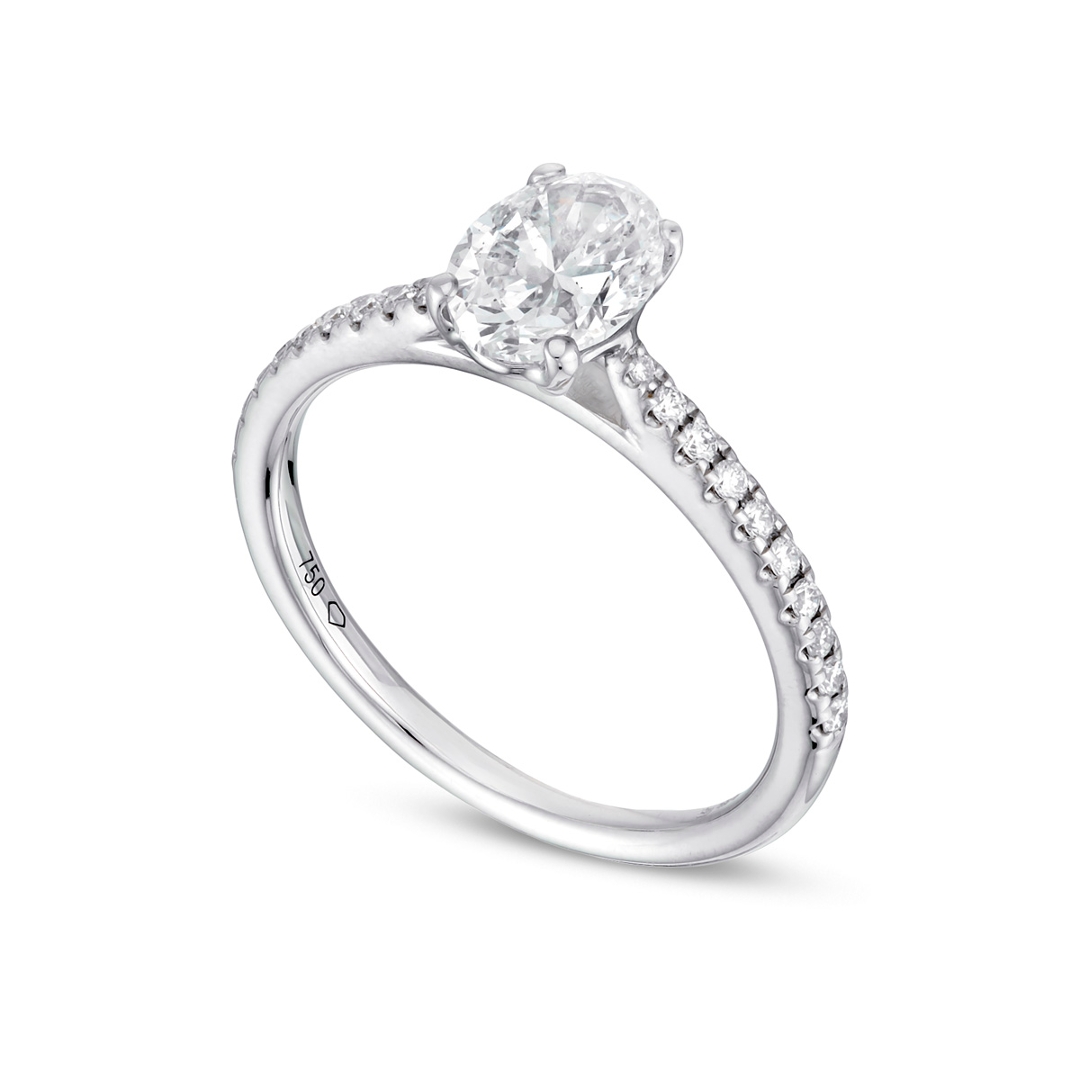 The 18ct white gold setting offers a sleek, contemporary finish, perfectly suited to the elongated shape of the oval-cut diamond, creating a flattering, elegant silhouette on the hand. With a total weight of 2.75g, the ring is lightweight yet well-crafted, designed for both comfort and durability while maintaining a timeless aesthetic.