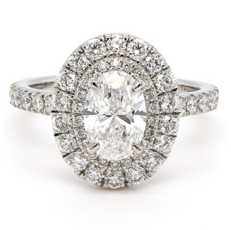 A brand-new, unused, GIA-certified natural diamond solitaire engagement ring, with one oval-cut diamond to the centre & a cluster of brilliant-cut diamonds in a double halo setting & on the shoulders, set in platinum.