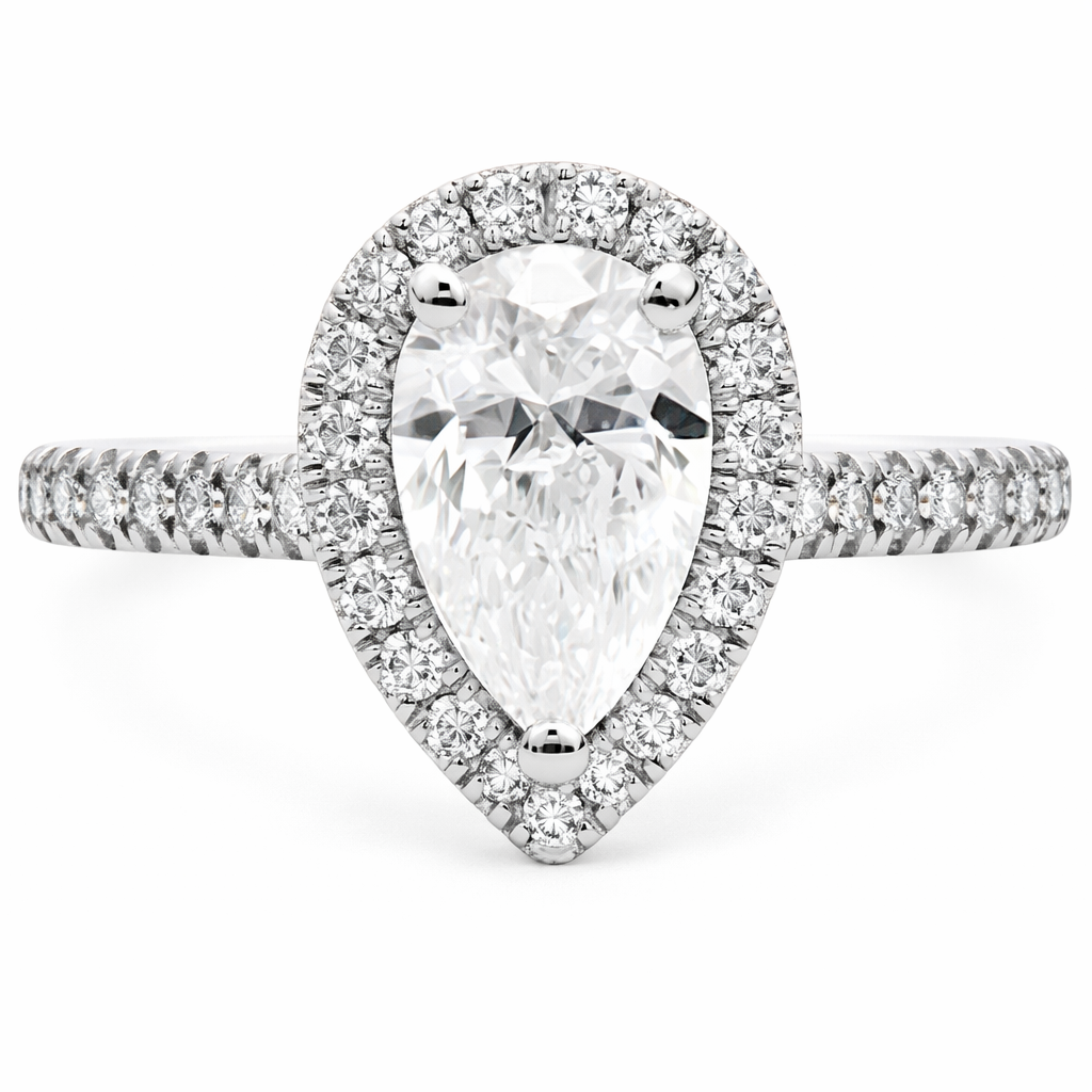 A brand-new, unused, GIA-certified natural diamond solitaire engagement ring, centred with a beautifully proportioned 0.90ct pear-cut diamond of striking E colour and SI2 clarity. The pear cut combines the brilliance of a round with an elegant tapered silhouette, creating a flattering, elongated presence on the hand while delivering impressive fire and scintillation. Surrounding the centre stone is a halo of brilliant-cut natural diamonds, extending onto the shoulders and adding a further 0.33ct of refined sparkle to enhance overall light performance.