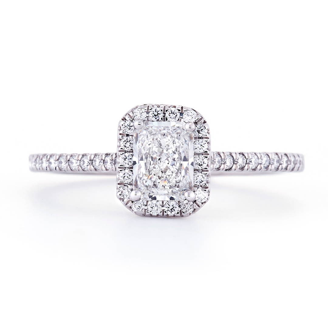 A brand new, unused GIA-certified natural diamond solitaire engagement ring set with one radiant-cut diamond to the centre & a cluster of brilliant-cut diamonds in a halo setting & to the shoulders, set in platinum.