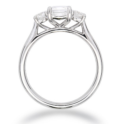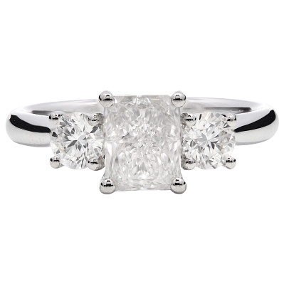 A brand-new, unused GIA-certified natural diamond solitaire engagement ring, with one radiant-cut diamond to the centre & two brilliant-cut diamonds to the sides, set in platinum.