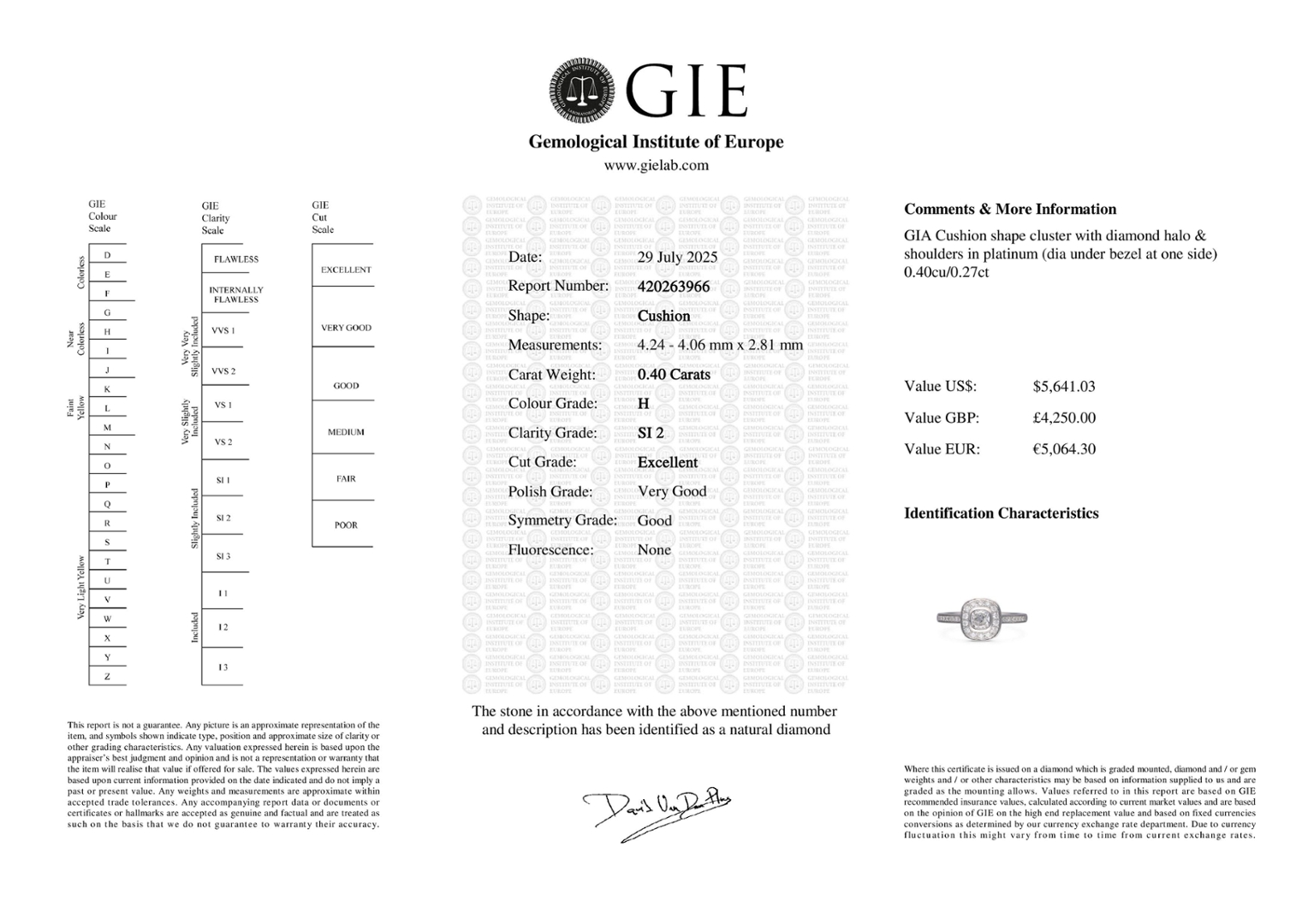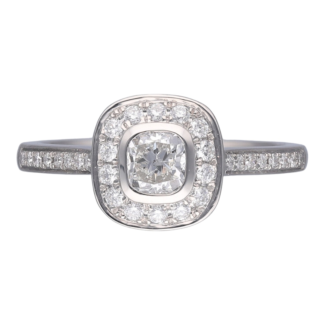 At a valuation of £4,250.00, this ring offers an excellent opportunity to acquire a certified natural diamond with enduring appeal. Its combination of a cushion-cut centre stone, a halo setting, and diamond shoulders makes it a sophisticated engagement ring and a timeless addition to any fine jewellery collection.