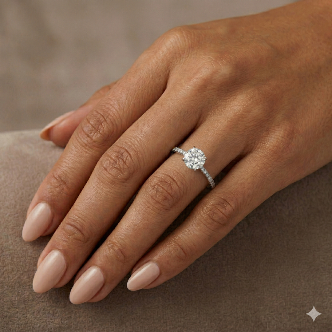 A delicate cluster of brilliant-cut diamonds set along the shoulders enhances the centrepiece, adding graceful sparkle and balance to the overall design. These shoulder diamonds have a combined weight of 0.12ct, impressive clarity of VS1-VS2, and a G-H colour grade, contributing to the ring’s radiance and sophistication without overshadowing the central gem.