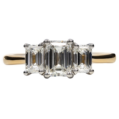 A brand-new, unused GIA-certified natural diamond three-stone cluster ring, with three emerald-cut diamonds, set in platinum & 18ct yellow gold.