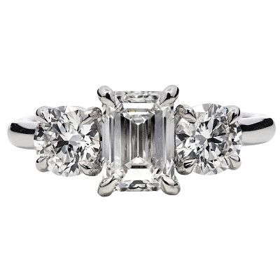 A brand-new, unused GIA-certified natural diamond three-stone cluster ring, with one emerald-cut diamond to the centre & two brilliant-cut diamonds to the sides, set in platinum.