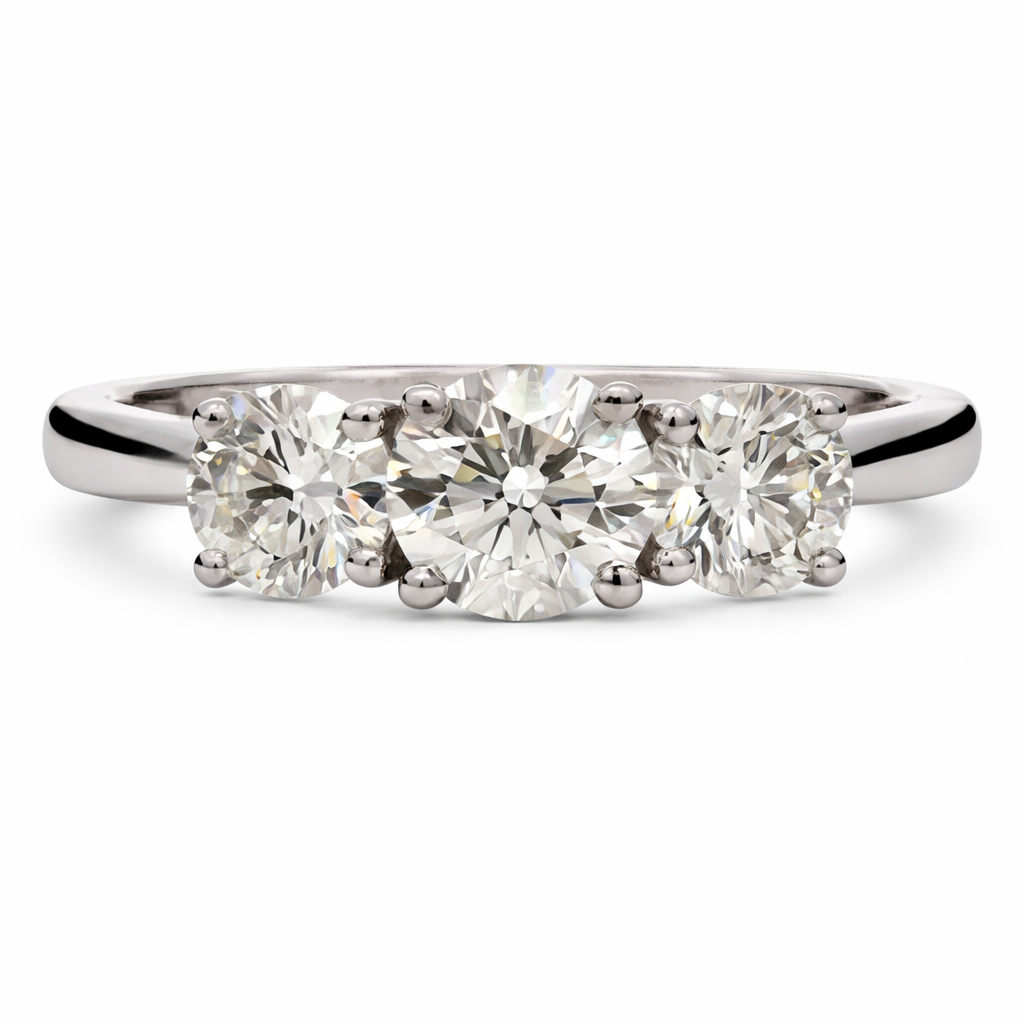 A brand-new, unused GIA-certified natural diamond three-stone eternity ring, set with three beautifully matched brilliant-cut diamonds totalling 1.31ct, elegantly mounted in platinum. The classic three-stone design symbolises past, present and future, offering both sentimental significance and timeless appeal, while allowing each diamond to stand out with balanced presence and refined proportion across the setting.