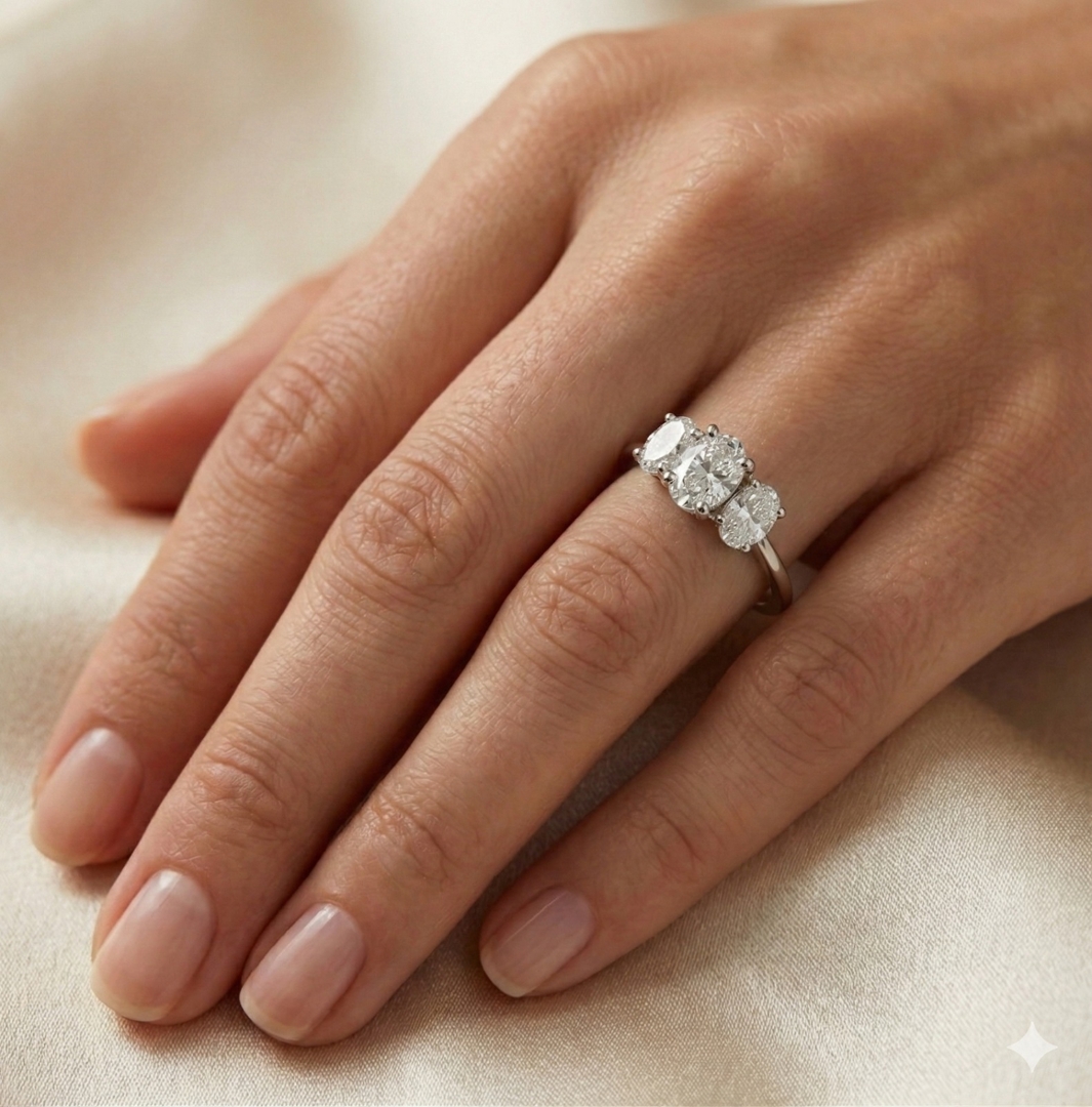 A brand-new, unused GIA-certified natural diamond three-stone eternity ring, set with three beautifully matched oval-cut diamonds totalling 1.31ct. Each stone has been selected for its lively brilliance and elegant proportions, with the oval cut offering exceptional light return while creating a flattering elongated appearance across the finger. Graded E colour and SI1 clarity, the diamonds display outstanding whiteness within one of the highest colour classifications, delivering crisp brightness and impressive sparkle.
