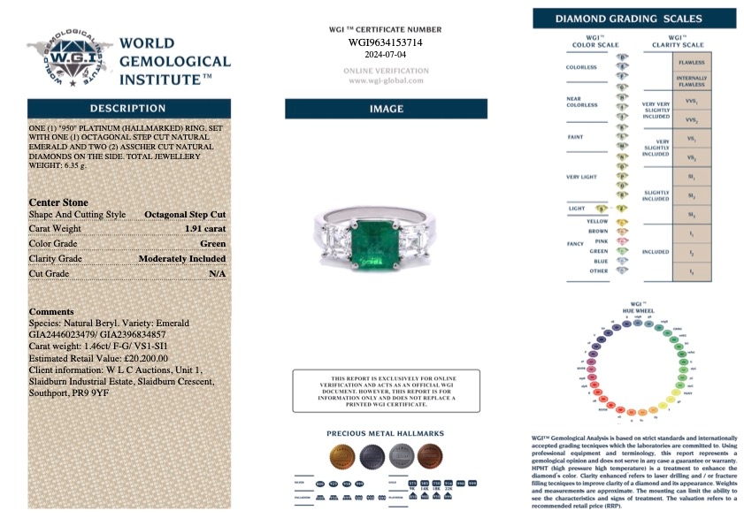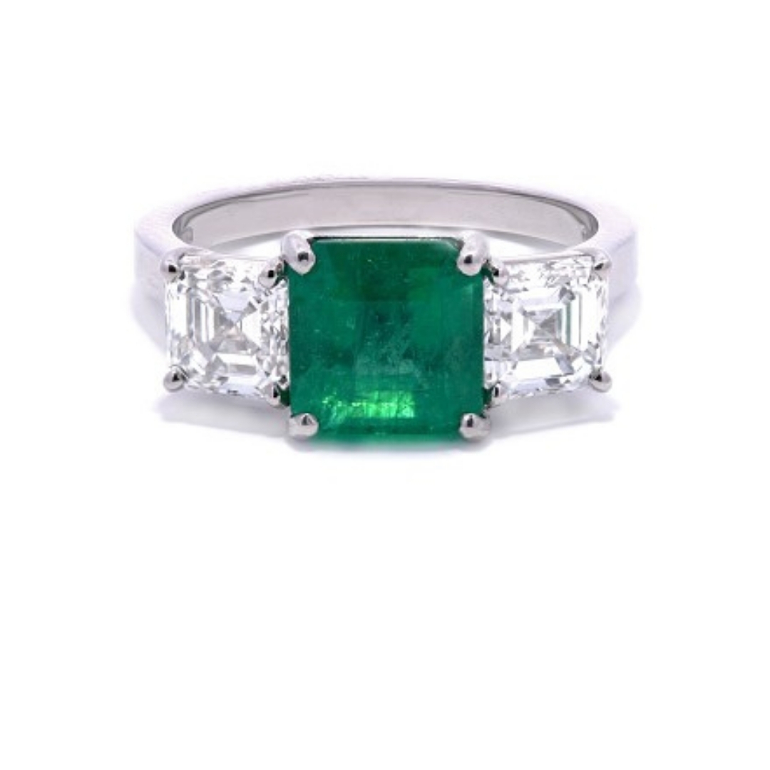 Flanking the central emerald are two asscher-cut diamonds, totalling 1.46 carats. Known for their elegant square shape and step-cut facets, asscher-cut diamonds add a touch of modern elegance to the design. These diamonds, graded between VS1 and SI1 in clarity, have very slight inclusions that are not visible to the naked eye, ensuring they retain exceptional brilliance. With a colour grade of F-G, the diamonds are nearly colourless, creating a stunning contrast with the rich green emerald while maintaining their bright and radiant appearance.