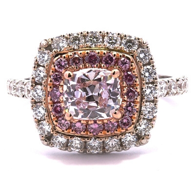 A brand-new, unused, GIA-certified natural diamond solitaire engagement ring, with one cushion-cut fancy pink diamond to the centre & a cluster of fancy pink diamonds & natural brilliant-cut diamonds in a double halo setting & on the shoulders, set in platinum.
