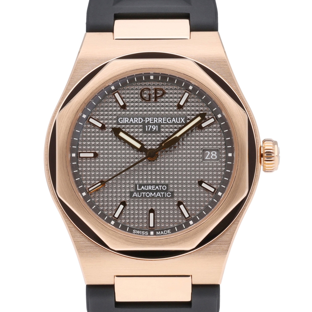 A Girard-Perregaux Laureato (ref. 81005-52-232-BB6A) from 2018 is presented in full 18ct rose gold and paired with a contemporary grey dial featuring the iconic Clous de Paris hobnail texture. Measuring 38mm, it strikes a perfect balance between refined proportions and everyday presence, housing a high-quality automatic movement.