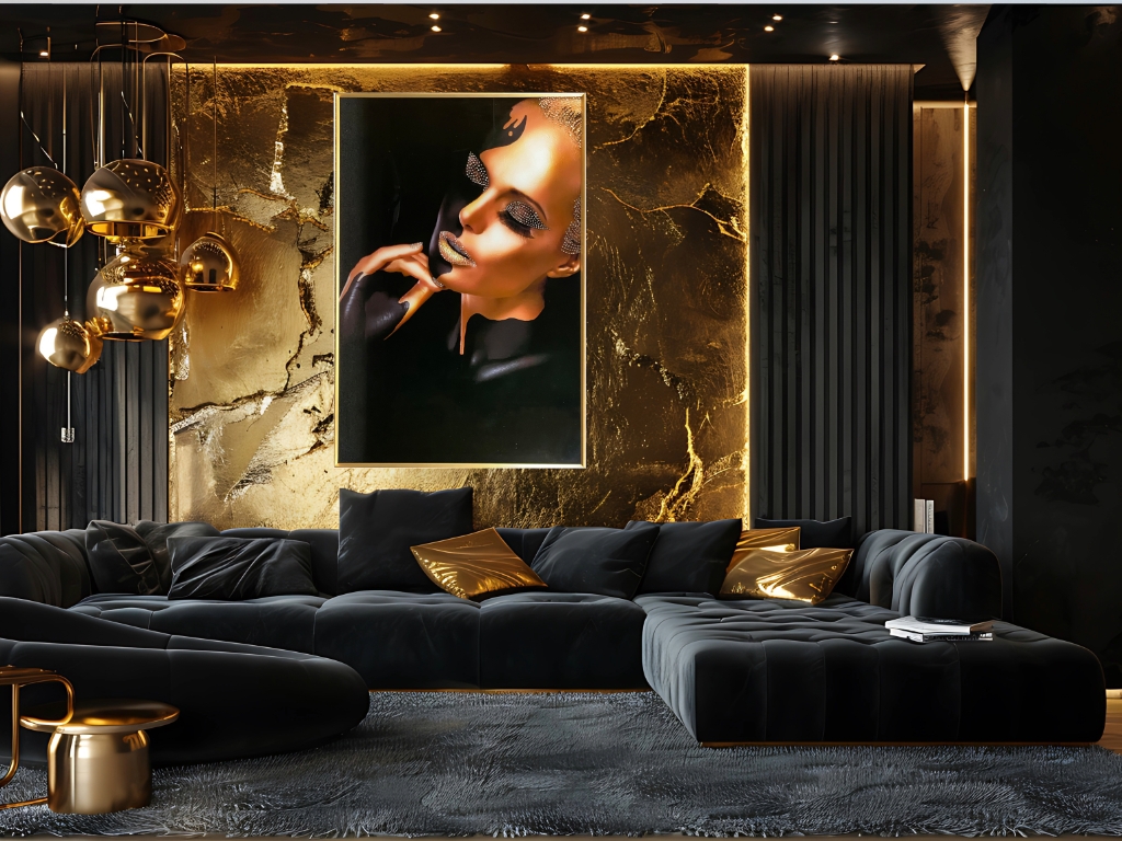 A glass art picture featuring a bronze and black colour face of a lady adorned with crystal embellishments, elegantly framed in a luxurious gold frame. This captivating artwork blends modern aesthetics with timeless elegance, creating a visually stunning composition that commands attention and adds sophistication to any space.