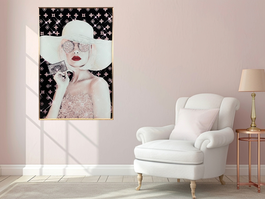 A Glass Art Picture of a Designer Lady in a White Hat with crystal embellishment in a rose gold frame.