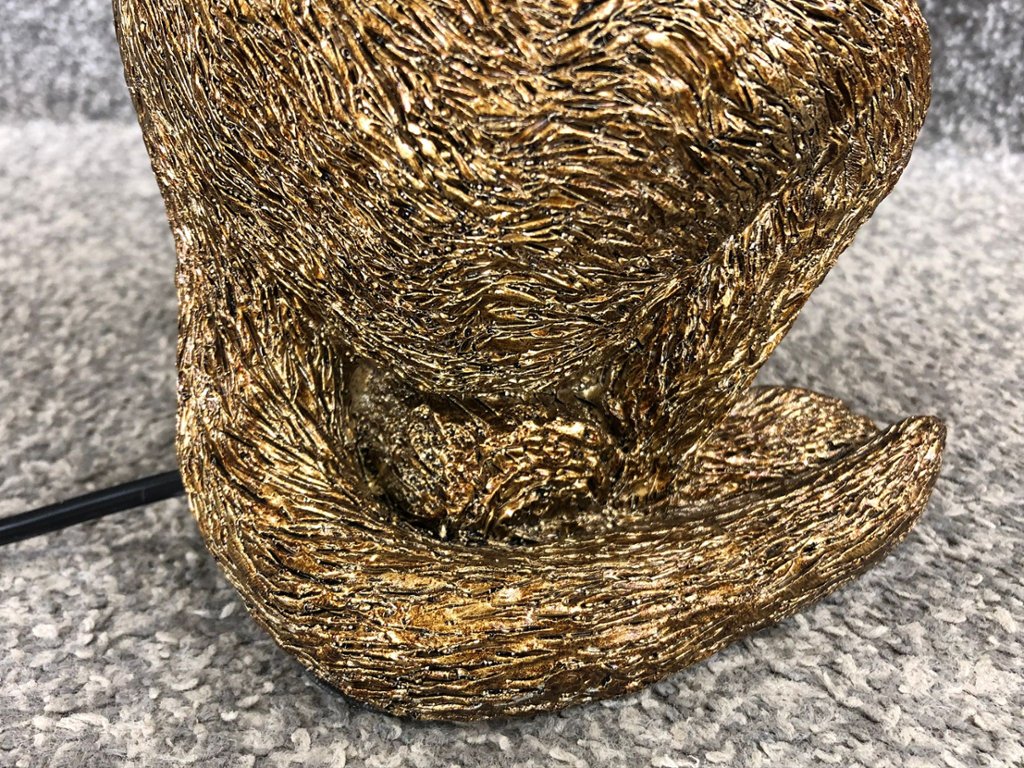A gold meerkat-style table lamp is a playful yet elegant addition to any interior. Standing approximately 27 inches tall and 15 inches wide, it combines artistic charm with a bold, modern aesthetic. The lamp features a finely detailed meerkat figure crafted from gold resin, its upright stance exuding character and curiosity while lending a whimsical touch to your décor.