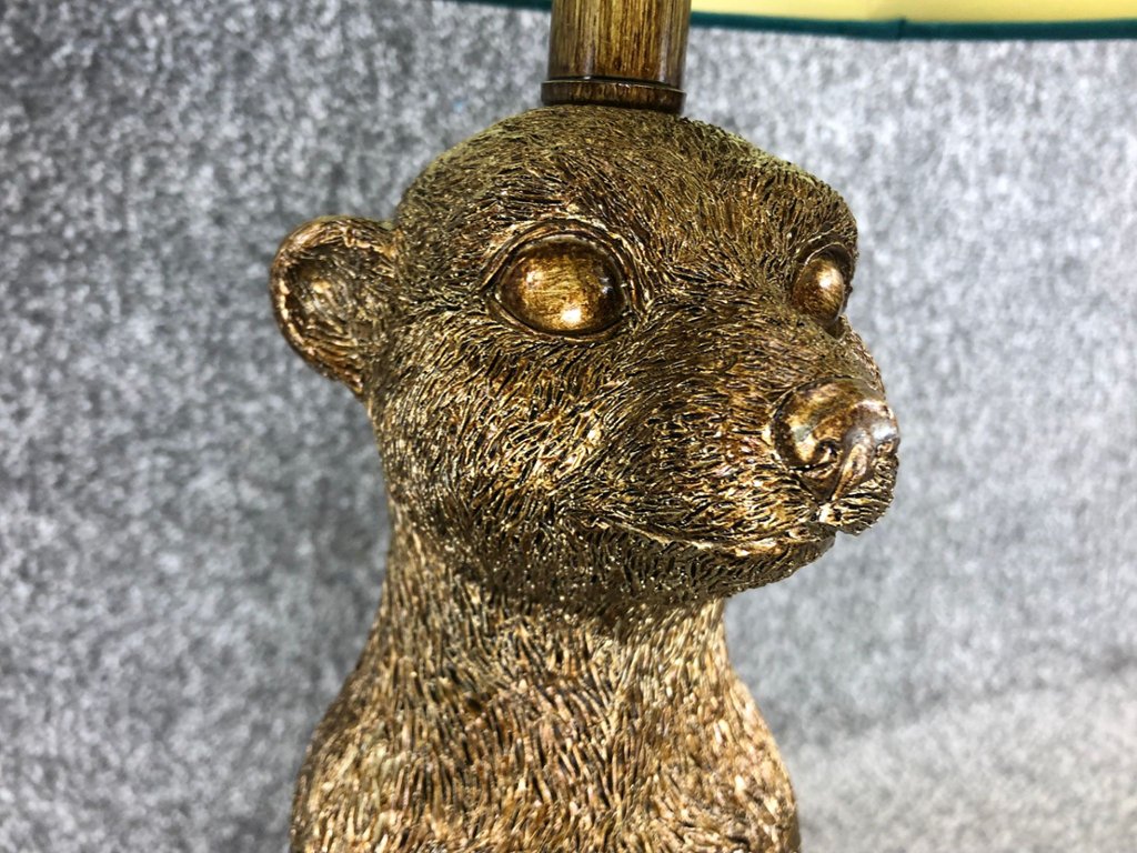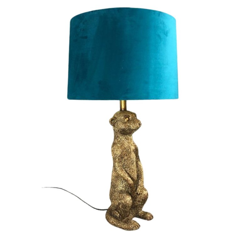 A gold meerkat-style table lamp is a playful yet elegant addition to any interior. Standing approximately 27 inches tall and 15 inches wide, it combines artistic charm with a bold, modern aesthetic. The lamp features a finely detailed meerkat figure crafted from gold resin, its upright stance exuding character and curiosity while lending a whimsical touch to your décor.