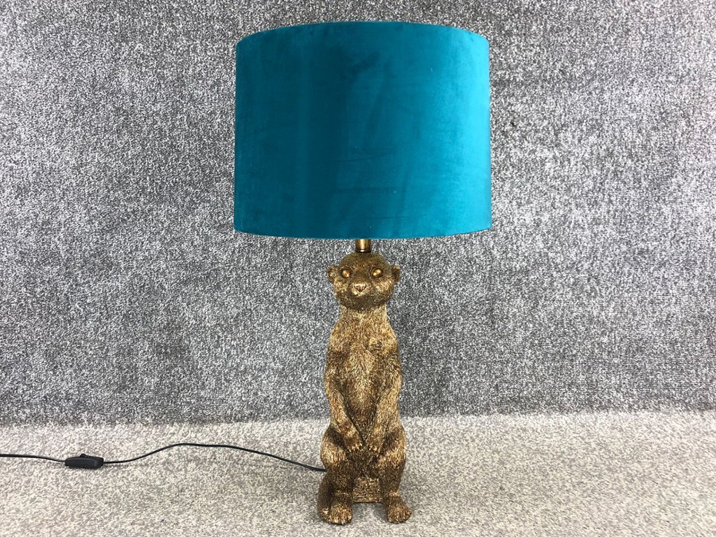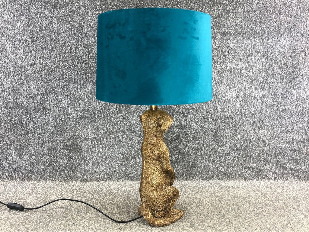 A gold resin Meekcat style table top lamp with a blue velvet shade. Approx 27" height, 15" width.