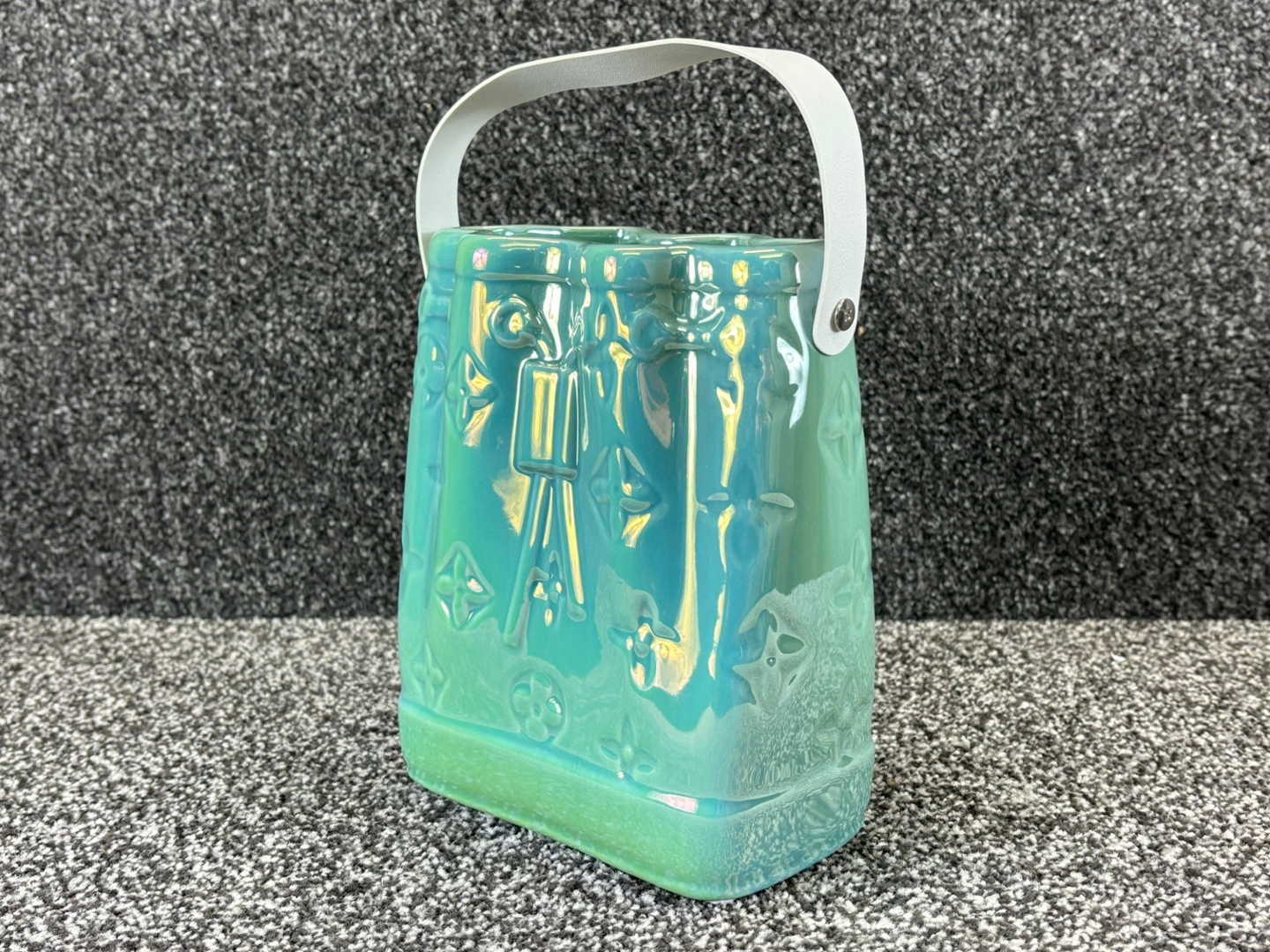 A Green Ceramic Handbag Vase with a White Handle. Approx 20cm height, 15cm width, 8cm depth.