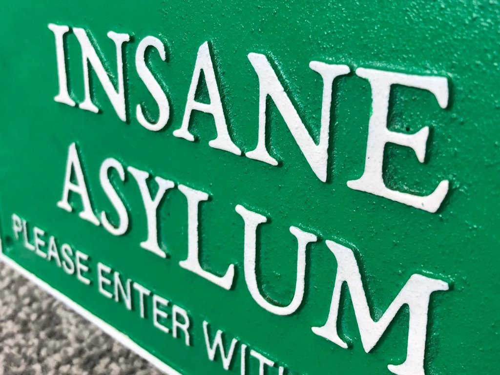 A green cast iron Insane Asylum wall plaque. Approx 11" height, 5" width.