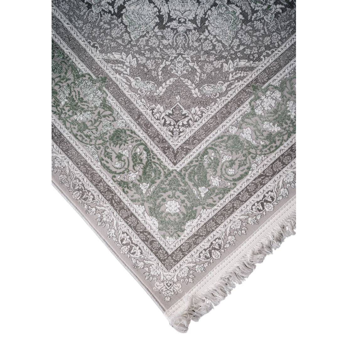 A finely woven Persian-style carpet features a rich green base adorned with elegant floral motifs and intricate detailing. The design flows harmoniously from the central medallion outward, framed by decorative borders that highlight its traditional artistry and timeless charm.
