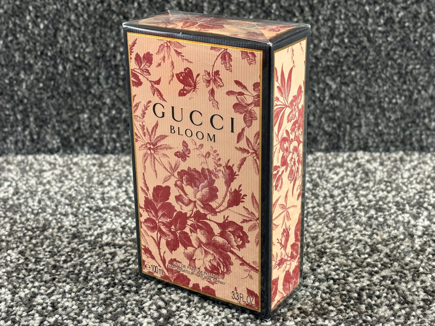 A 100ml bottle of Gucci Bloom Eau de Parfum, presented in its
