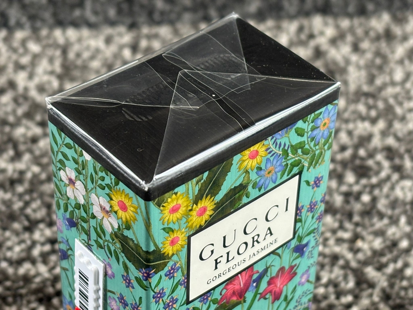 A bottle of Gucci - Flora Gorgeous Jasmine Eau De Parfum in a presentation box.
