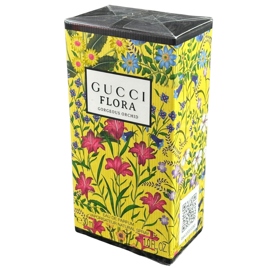 A 30ml bottle of Gucci Flora Gorgeous Orchid Eau de Parfum, presented in its original Gucci presentation box, offering a vibrant and modern fragrance from the celebrated Flora collection. The beautifully decorated bottle featuring the iconic Flora motif makes this an attractive choice for gifting or adding to any personal perfume selection.