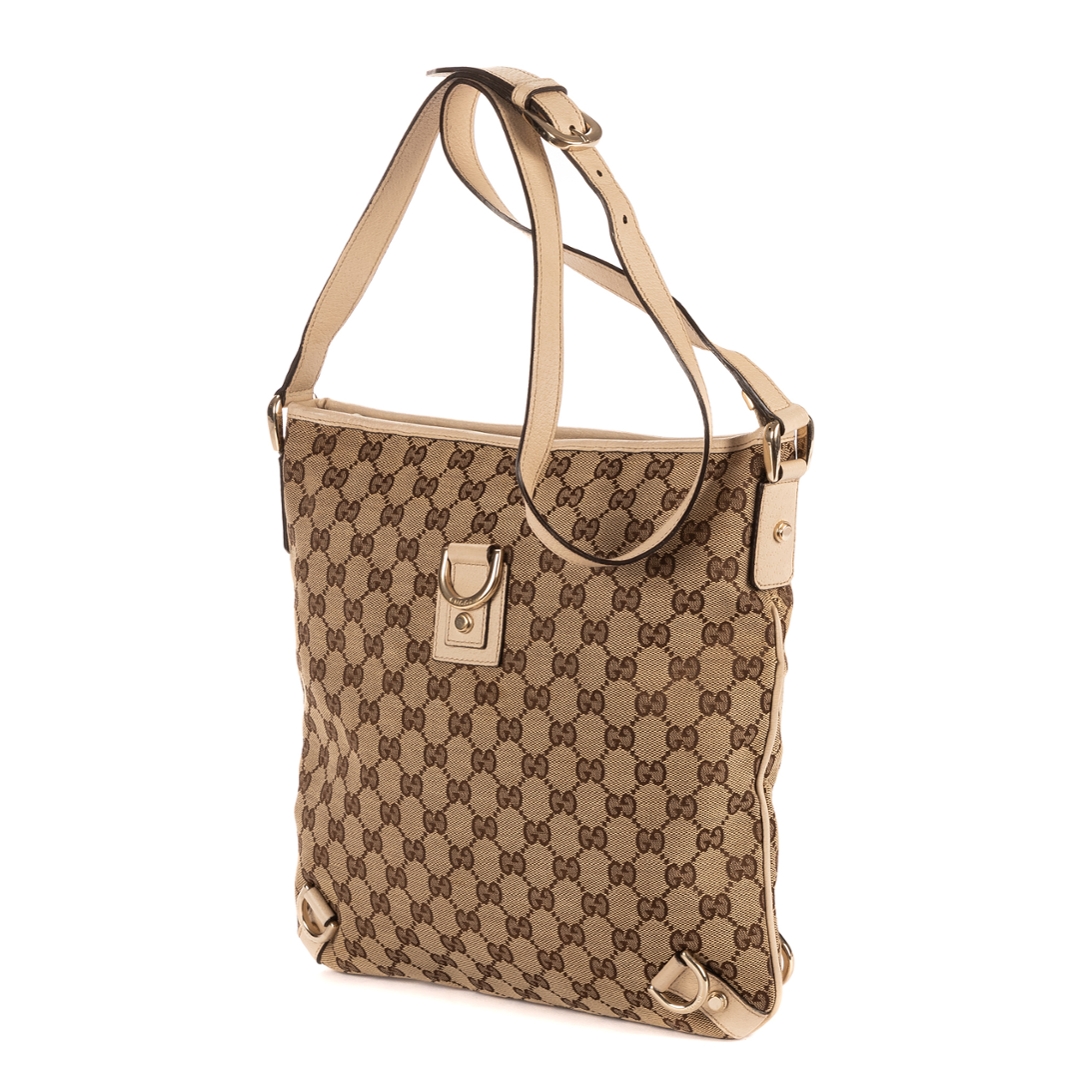 A vintage Gucci ivory and beige GG canvas Abbey D-Ring Messenger bag, featuring the house’s signature monogram pattern in a warm, neutral palette. The design is complemented by smooth ivory calf leather trim, creating a refined contrast that enhances its classic appeal. Finished with gold-tone hardware and the iconic front D-ring detail, this piece reflects Gucci’s recognisable early 2000s aesthetic with effortless sophistication.