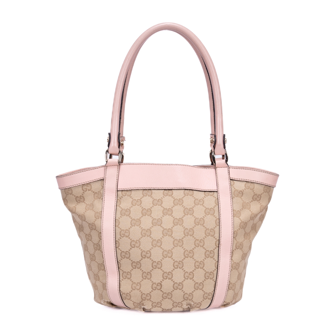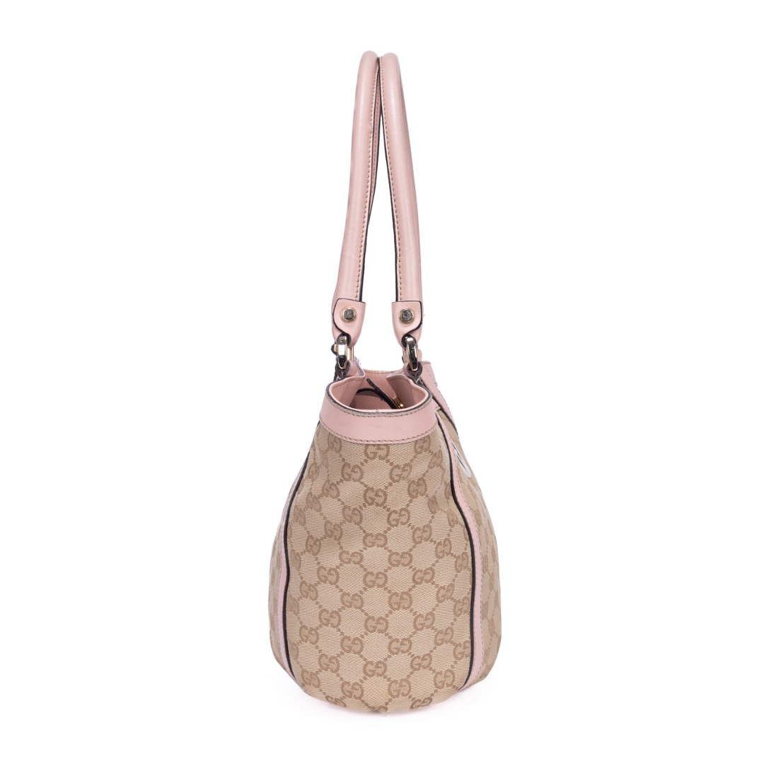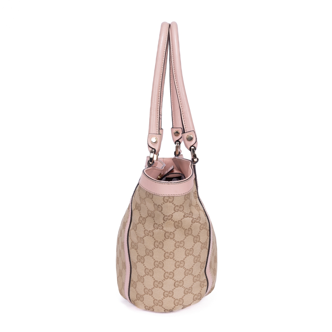 A vintage Gucci beige/pink canvas Abbey D-Ring Tote bag with a certificate of authenticity, Approximately 25cm height, 20cm width.
