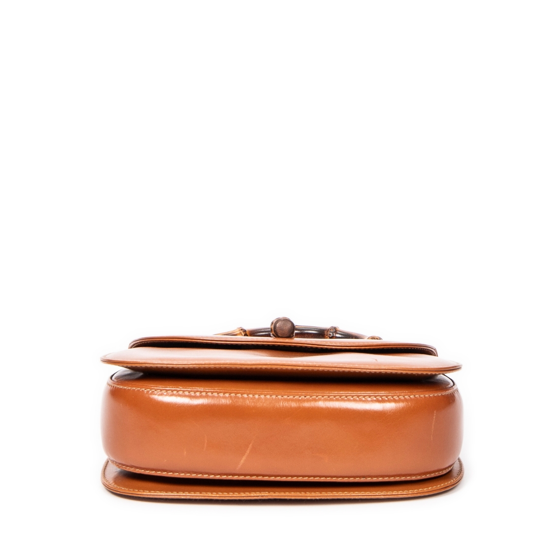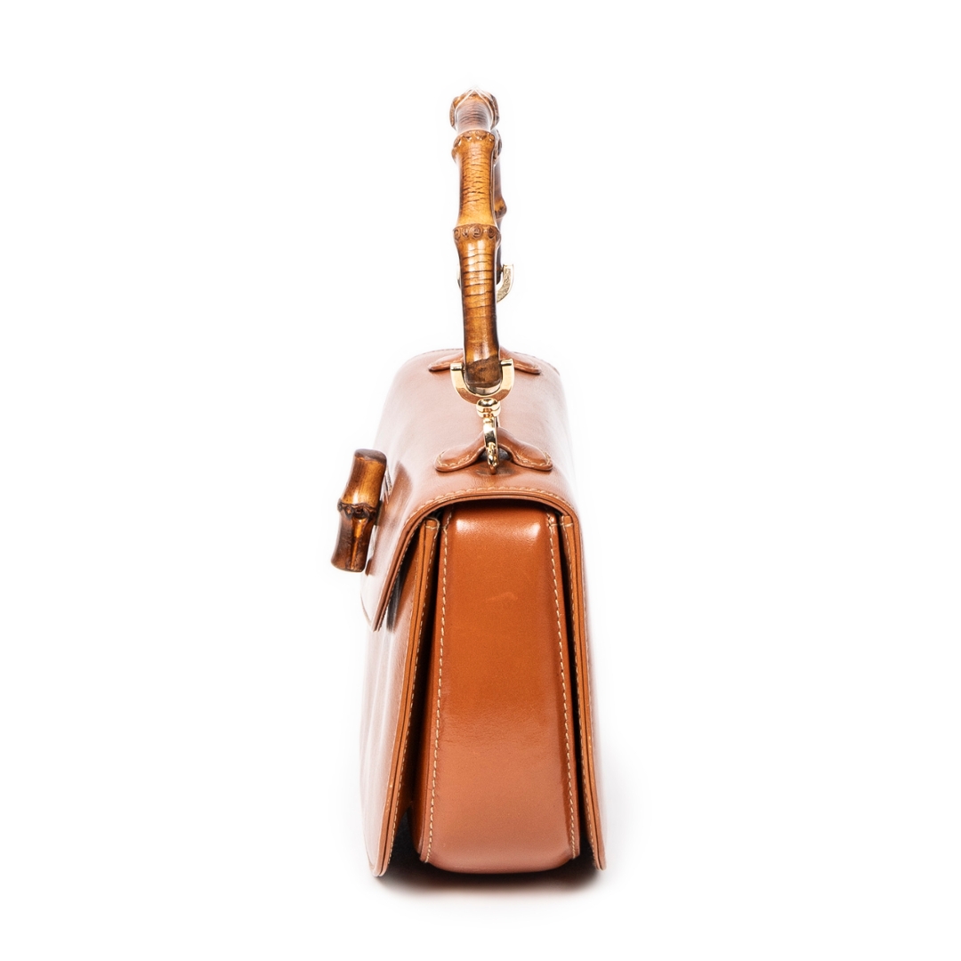 A vintage Gucci Bamboo Top Handle Flap Smooth Calfskin Leather bag with a certificate of authenticity, Approximately 15cm height, 22cm width.